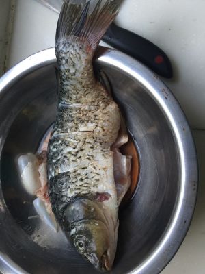 鲤鱼去腥筋,切刀口,这条鱼在冰箱冷冻过,所以把鱼头下面和肚子下面的鱼鳍去掉了,用料酒和一点盐腌制一会。
