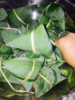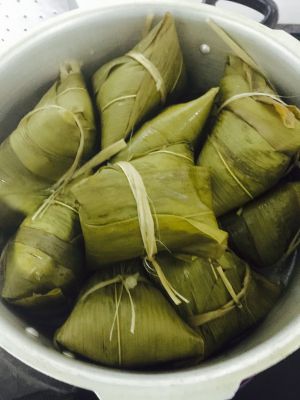 按顺序放进高压锅,插插插,角角对整理插严实,最后在上面压个东西,我娘家是压一个很大的石头,我家没有,粽子也装的比较满,正放一个碗进去压着盖起来刚好。高压锅煮40分钟左右,不要开盖子蒙1个小时再吃,特别劲。粽子就放在这个原汤里,放阴凉的地方两三天不会坏的,换水就坏了。也可以拿出来放冷冻,随吃随热。