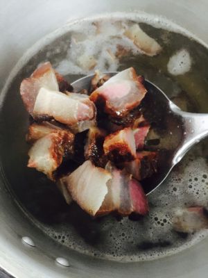 腊肉切块放沸水里煮20分钟,捞出过水后待用。肥瘦相间比较好吃。