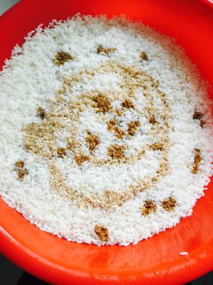 糯米放生抽老抽搅拌均匀,量不用太多,腊肉本身就有盐分。