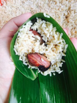 两个粽叶重叠卷成漏斗形状,放入糯米和腊肉,另一只手将尾部的粽叶覆盖到糯米上,然后粽子倒置到右手,左手大拇指和无名指将两边两个角使劲收好,右手大拇指和食指将最顶端的角收好,多余粽叶像右下折,左手握紧右手拿绳,用牙齿和手把粽子绑两圈系紧就好。