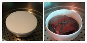 蒸锅加够水大火烧开,炖盅盖好盖子后放入蒸锅大火蒸约3小时;滗去汤汁后再干蒸1小时至肉方酥软即可。