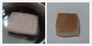 五花肉切方块,放入沸水中加料酒焯5分钟,捞出洗净后修整好形状;