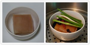将修整好的五花肉放入炖盅内,加入米酒、豆豉、生抽、老抽、红糖、干辣椒,再放入适量香葱段;