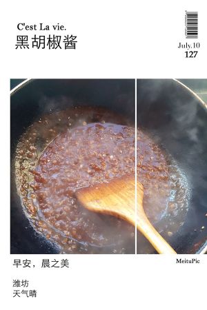 制作黑胡椒酱汁,自制的会比买的好吃且干净新鲜,洋葱跟蒜切成碎末,锅内黄油,没有黄油植物油也可以,然后放入洋葱跟蒜翻炒,煸炒至洋葱透明,加入适量黑胡椒粉,快速翻炒,倒入适量水,没过食材就好,小火至沸腾后加入番茄酱,蚝油,糖,不够咸的话可以再加盐,够味了的话不要再加了,汤汁浓稠后捞出备用