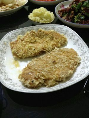 再将裹了蛋液的鸡肉沾上一层面包糠,个人推荐用不加色素的,健康而且出来效果很好