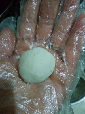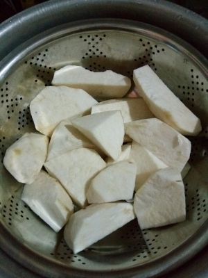 红薯像这样切成小坨,上蒸锅蒸熟捣碎加人白糖备用。