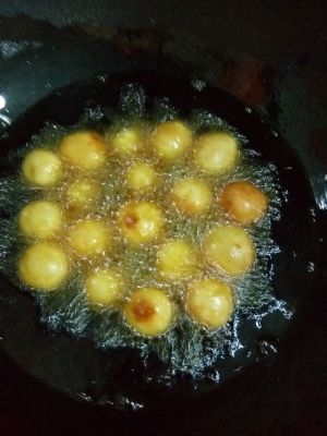 热锅放入菜油,油热后关小火放入丸子慢慢炸……