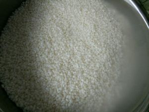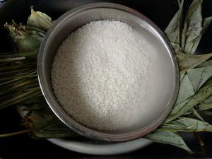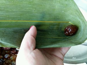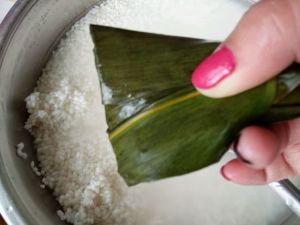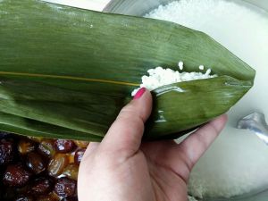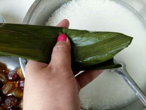 加两汤勺左右江米,把粽子叶按照我滴手势折一下