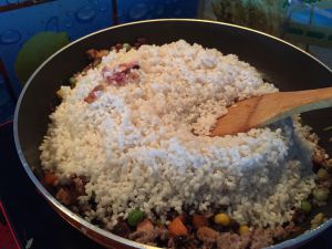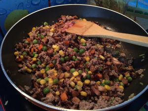 继续加入蔬菜丁(我用的是速冻的什锦蔬菜丁 你也可以用新鲜的 同时还可以再加入土豆丁等自己喜欢的配菜);