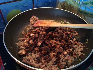 肉馅翻炒均匀后再加入香菇丁(我买的是鲜香菇所以直接水洗净后剁碎即可 如果是干香菇 记得要提前泡发哦);