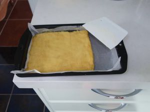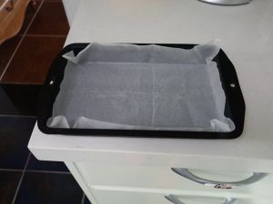 任意平底容器,我找了个长方形烤盘,垫上一块烘焙油纸。