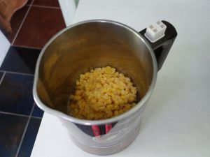 蒸好的豌豆与白砂糖一起倒入搅拌机搅打至茸,我用的豆浆机的果蔬汁功能。也可以碾压成茸,要费力一些。