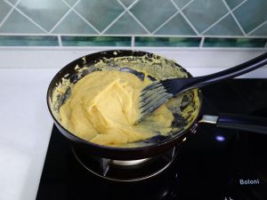 豌豆茸放锅里,中火不停翻炒,让它水分蒸发。注意千万不能偷懒哦,否则会糊锅。