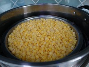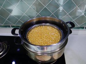 蒸盘里加水,水量以没过豌豆为宜。蒸锅烧水,放入蒸盘,旺火蒸约1小时20分钟。我先蒸了1个小时,尝了颗豌豆,不够软,决定继续。