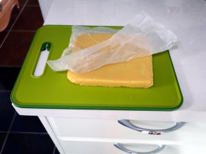 自然冷却后,蒙上保鲜膜,冰箱冷藏三小时。取出来倒扣,揭开油纸。