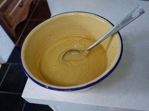 豌豆茸倒入平底容器里,表面用抹刀抹平。发现用的烤盘大了些,所以我特意没有铺满它。