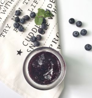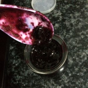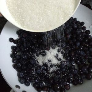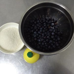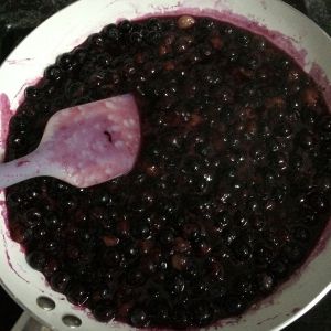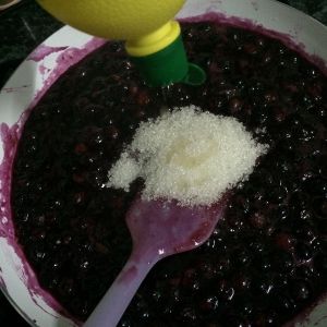 不粘锅烧热,倒下蓝莓跟一半糖搅拌。