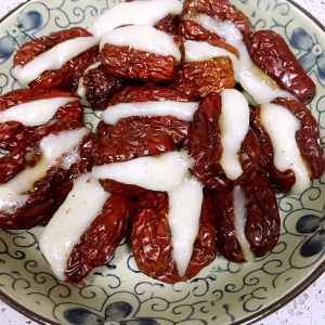 用温水揉糯米面,揉好后揪出一点放在切好的红枣中间