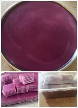 最后烧开水,放盘子锅蒸,按平时吃饭的碗8成满紫薯浆倒入盘子蒸3分钟,然后再放椰浆,依次循环,最后一层蒸10分钟。(温馨提示,头4~5层3分钟,之后的4~5分钟,中途水会烧干,要放一次热水。蒸完放凉,建议放冰箱冰一冰再拿出来切,够坚固切会很漂亮)