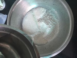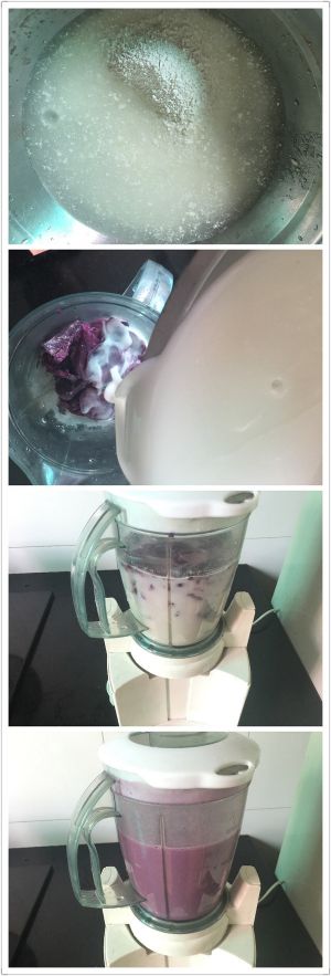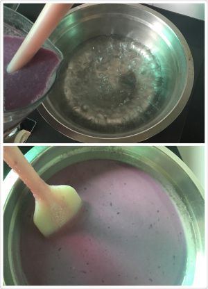 取350g水烧开,熄火,慢慢把刚才的紫薯浆倒进搅拌均匀,马蹄粉紫薯浆就完成,先放一边。