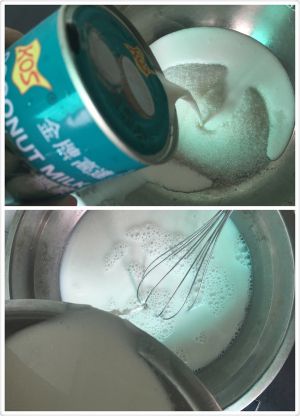 把400g椰浆倒入200g白砂糖搅拌均匀半烧开,熄火,倒入刚才的马蹄粉浆搅拌均匀,椰浆马蹄粉浆就完成。
