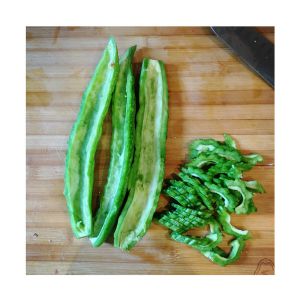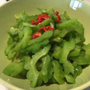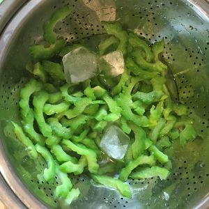 准备苦瓜,拿勺挖掉中间瓤,切片。