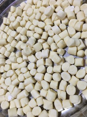 加入木薯粉,揉均匀,然后取一块面团,搓成长条,搓的时候粘手的话可以撒点木薯粉在面板上,再搓,轻一点搓成长条,然后刀切成你想要的大小。