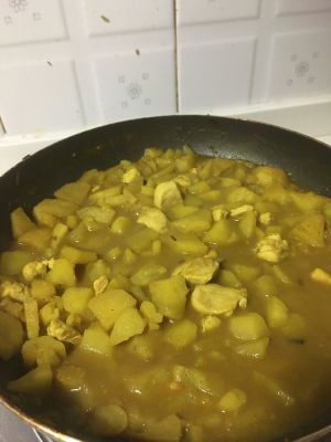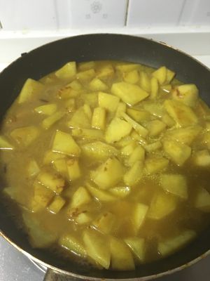 刚才炒鸡肉的油直接把土豆放进去翻炒,翻炒得油也差不多了,就加入两勺,平时吃饭那种勺子咖喱粉,再次翻炒。接着放入水翻均匀咖喱粉。中火煮。知道用勺子轻易铲断土豆。