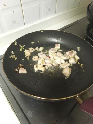我喜欢加葱让油过一下因为那样很香,这个是个人习惯。大家不必都这么做,油热后把葱放进去爆香然后放入鸡胸肉翻炒至白色。就可以捞出了。