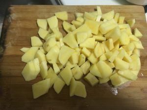 先将土豆削皮切成小块,不要太大,因为要缩短煮的时间,太大块就比较不容易烂没有土豆和咖喱融在一起的美味。