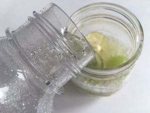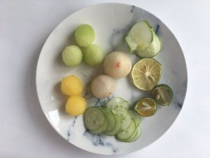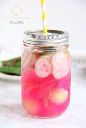 取一玻璃杯,把各种果蔬材料放入,倒入气泡水,加入适量蜂蜜即可。