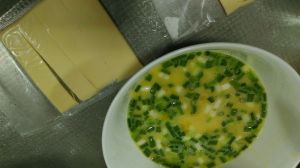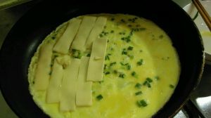 鸡蛋打散,加葱花儿。奶酪切条备用