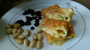 不粘锅放油,油热后倒入鸡蛋,鸡蛋凝固后关火,加入切片的奶酪。我加了两片奶酪。加的时候注意不要放边上,我都放太边上了,奶酪融化后最后有点漏出来