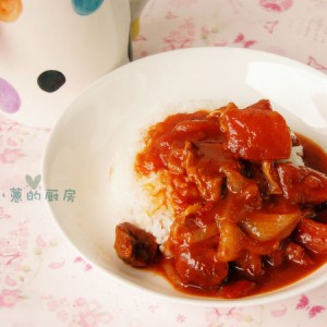 炖好的番茄牛腩浇在热米饭上。