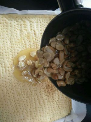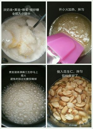 【制作馅料】将淡奶油,黄油,蜂蜜,细砂糖全部倒入小奶锅中,开小火煮到沸腾就关火避免煮久了糖浆糊掉。关火后加入花生仁搅拌均匀馅料就做好了!