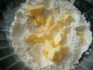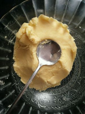 室内软化的黄油加入面粉中,用勺子按压黄油和面粉,直至看不到明显的黄油!