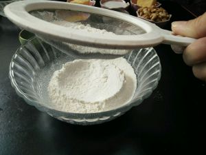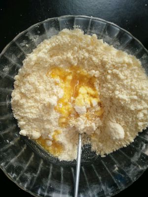 【和面团】低粉,糖粉,泡打粉混合过筛+鸡蛋液加盐打匀。