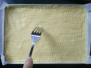 把饼皮移入烤盘内,用餐叉在饼皮上刺上小孔,防止饼皮在烘烤时鼓起。