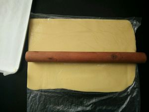 【制饼皮】把面团拿出来擀成和烤盘大小差不多的饼皮。烤箱预热180度。