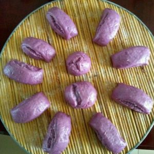 面粉,紫薯,炼乳水与酵母混合,揉成光滑面团,放在温暖处发酵至两倍大。