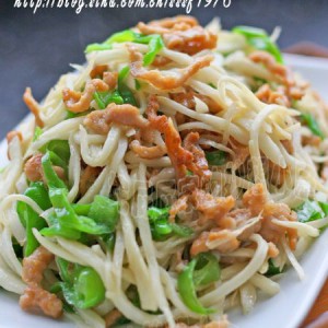 煎锅倒适量的油,大火烧热,下入肉丝扒熟;