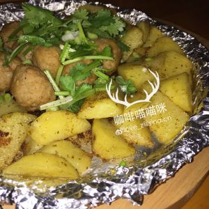 铁板上包一层锡纸,将土豆块放入,由于鸡肉丸子是半熟制品,待土豆煮用筷子可穿过,便可将鸡肉丸子放入,时不时要翻动,防止粘底