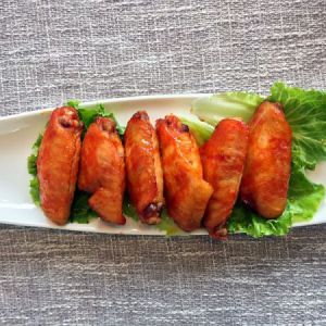 烤箱200度,上下火,预热8分钟。将烤翅放入烤架,烤20分钟,然后翻面,将剩余酱汁刷到鸡翅上,再烤十分钟