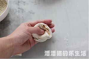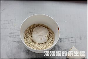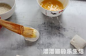 将刷了鸡蛋液的那一面放到生芝麻碗里按一下。