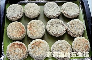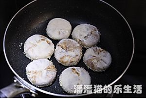 煎锅中放一点点底油,先把蘸着芝麻的一面放到锅里稍微煎一下,火要小,芝麻很容易上色。芝麻定型后翻面再煎一下,定型后取出。