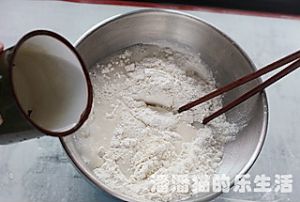 在自发粉里倒入微温的水,温水有助于自发粉中酵母发酵,但是温度不宜过热,不然酵母就失效了。