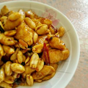加入调好的芡汁,待鸡肉炒熟后加入花生和切碎的干辣椒,快速翻炒即可出锅(花生我用的黄飞鸿的)