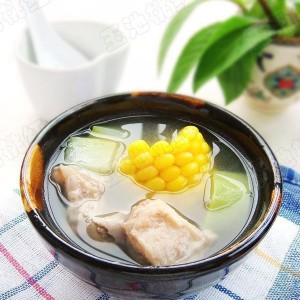 砂锅内加适量清水,放排骨和玉米,再放入姜和葱,大火煮开后,撇去表面的浮沫,转小火煲1—1.5小时。