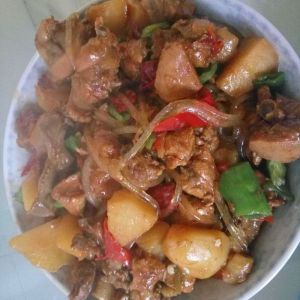 第二步把处理好的鸡洗干净切小块(不要太大,不好入味)用开水穿一下,土豆切块浸水洗去淀粉,都很简单也不上图了